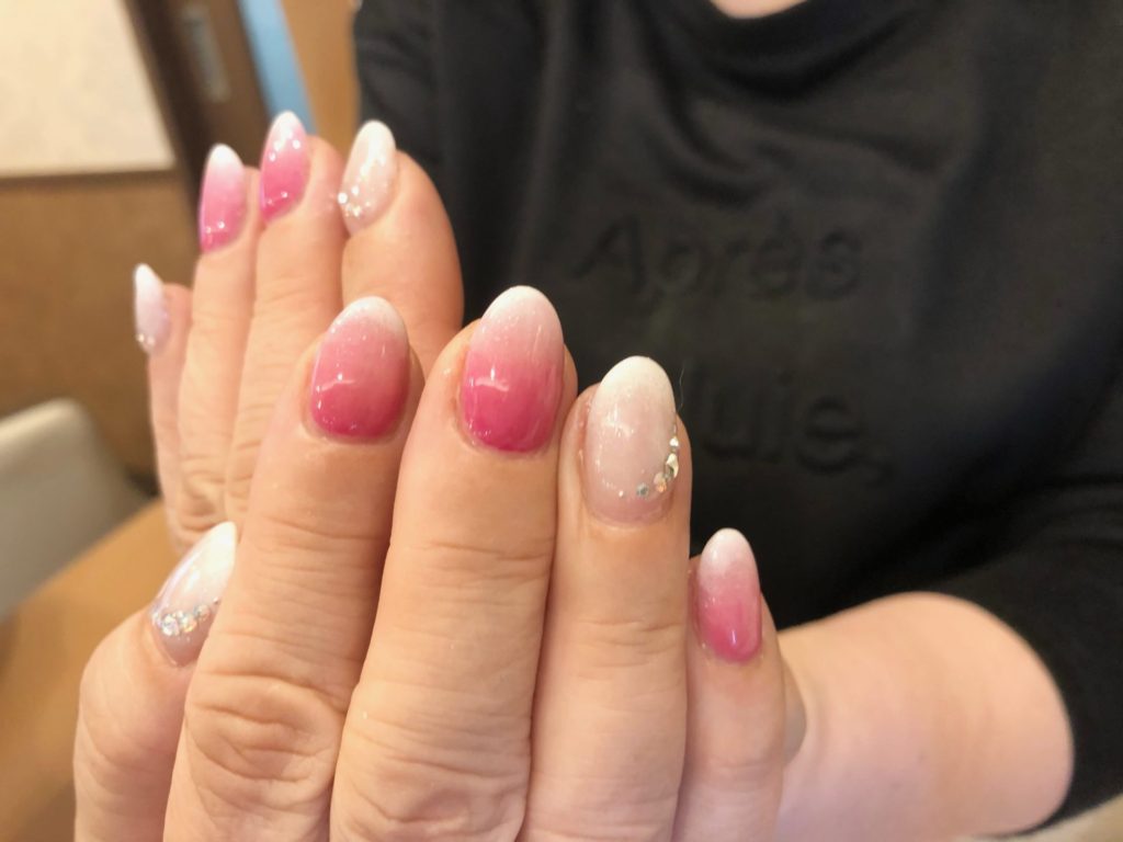 手足一緒に次のハンドと同じお客様です。ハンドは、花びらの様なデザイン。フットは、少しお色味をハッキリさせた濃いめのお色で。